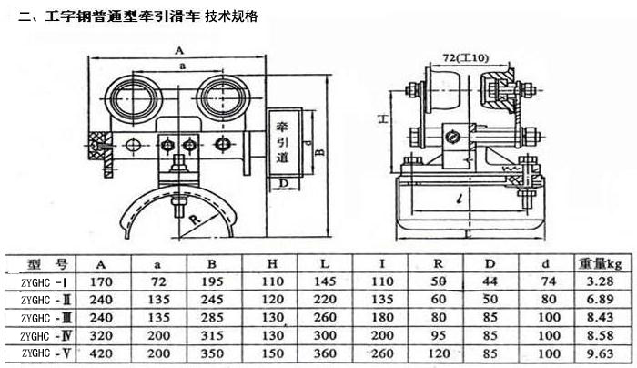 ZYGHC型工字鋼電纜滑車系列分為中載荷型、重載荷型和輕載荷型,因此滑車行走輪為Φ80、Φ63、Φ50的三種。承載能力<50~150kg,每類按托板層數(shù)分為單層、雙層、三層,每類中有三種形式。首端為電纜牽引車,終端為固定掛線架,中間為電纜滑車,該系列滑車分Ⅰ、Ⅱ、Ⅲ、Ⅳ、Ⅴ五種型號(hào),如用戶采用12#、14#、16#或更大號(hào)數(shù)工字鋼,可在訂貨時(shí)注明,本公司可成套供貨。